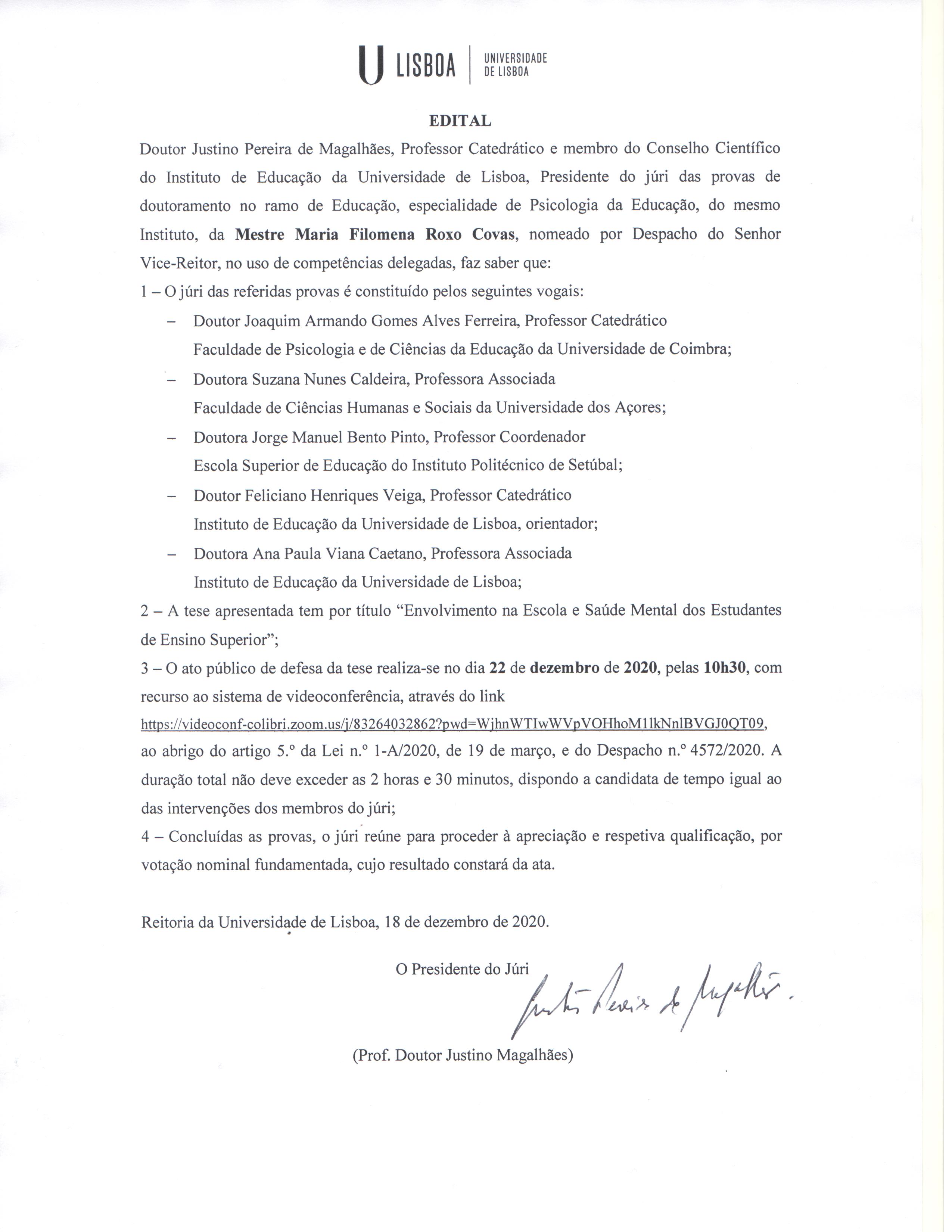 Edital– Prova de Doutoramento em Educação de Maria Filomena Roxo Covas